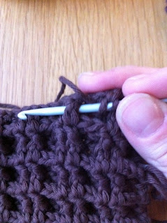 För att få själva våffelmönstringen virkar man i grupper om 2 stolpar. 2 st, 2 st om förra varvets stolpe, se steg för steg nedan.