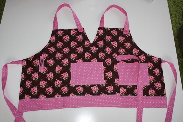 Jag har skrivit upp alla måtten, ifall jag kommer att sy fler, och jag har några grejer jag kommer att förändra till eventuellt nästa försök. Tänker att en tryckknapp kanske skulle vara bättre på en barnmodell, då det kan gå snabbt i svängarna när de vill få av sig förklädena. Jag rationaliserade även arbetsgången, så att jag klippte till alla delar och strök allt på en gång, sydde allt med raksöm som gick att sy på en gång, därefter all dekorationssöm, och sedan mer raksöm. Rätvände förklädet och strök igen, samt sydde igen vändhålet. Klart!